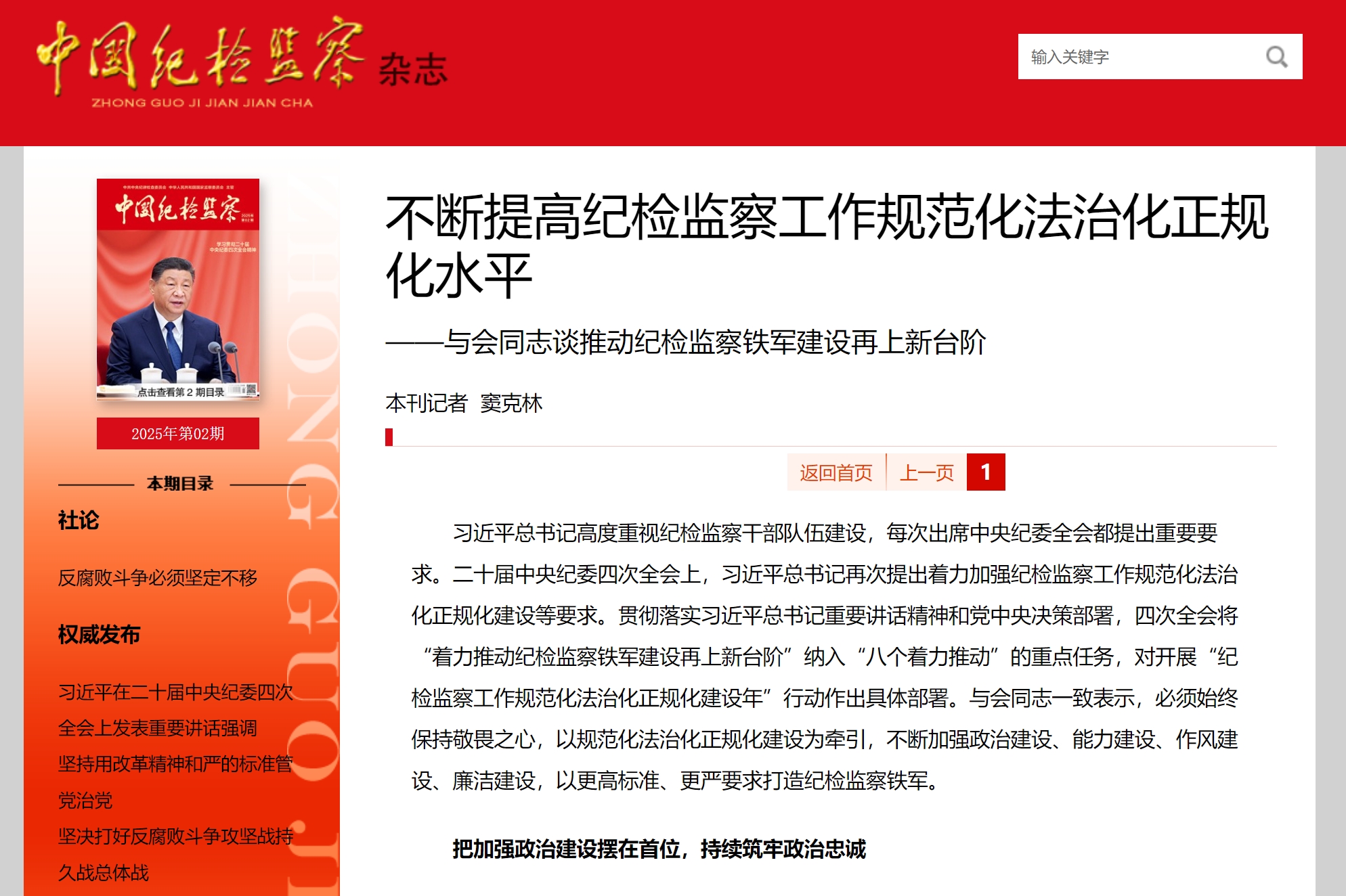 《中国纪检监察》杂志第2期刊发了二十届中央纪委四次全会召开期间,围绕推动纪检监察铁军建设再上新台阶,对省委常委、省纪委书记、省监委主任李元平等与会同志的采访内容。