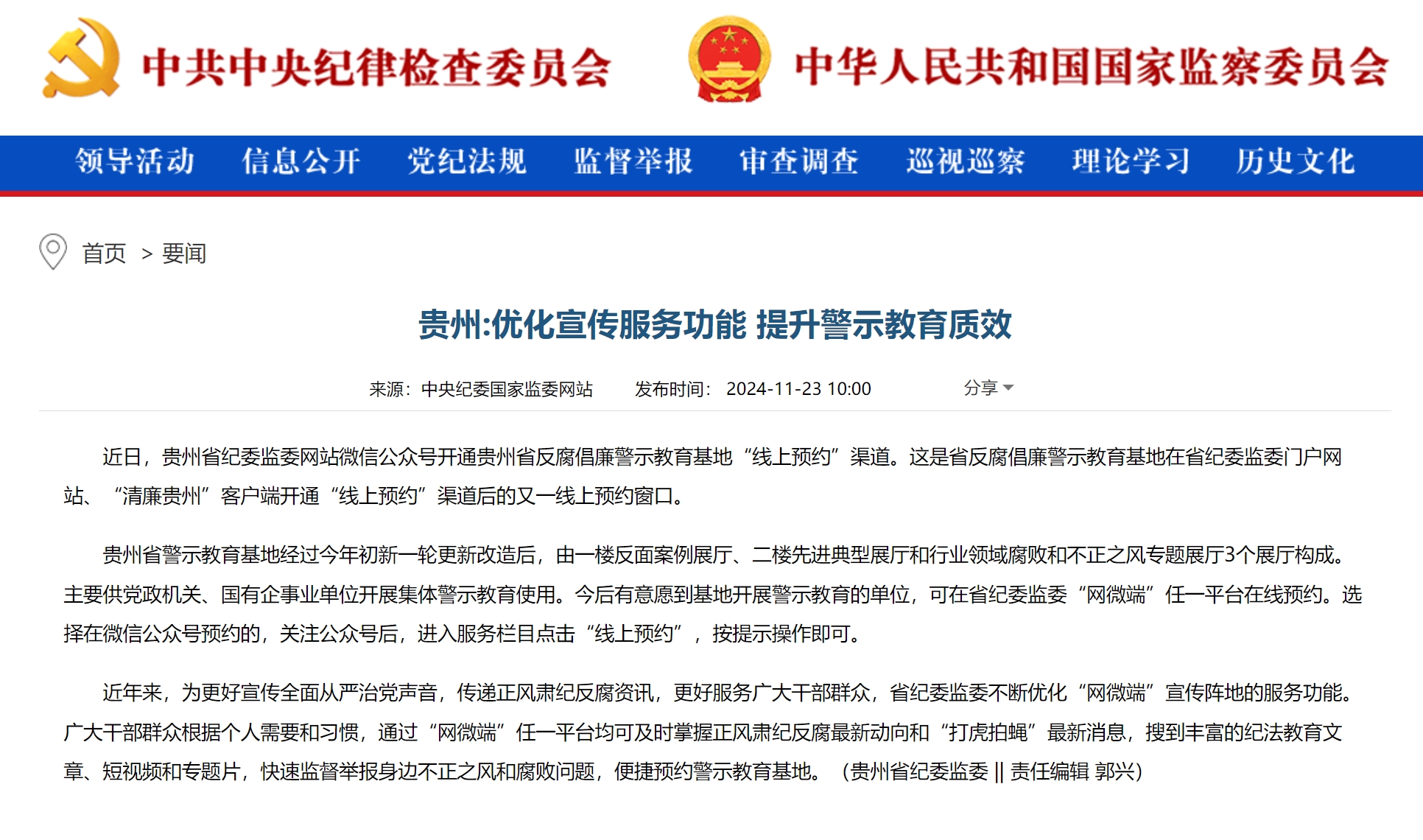 中央纪委国家监委网站|贵州:优化宣传服务功能 提升警示教育质效