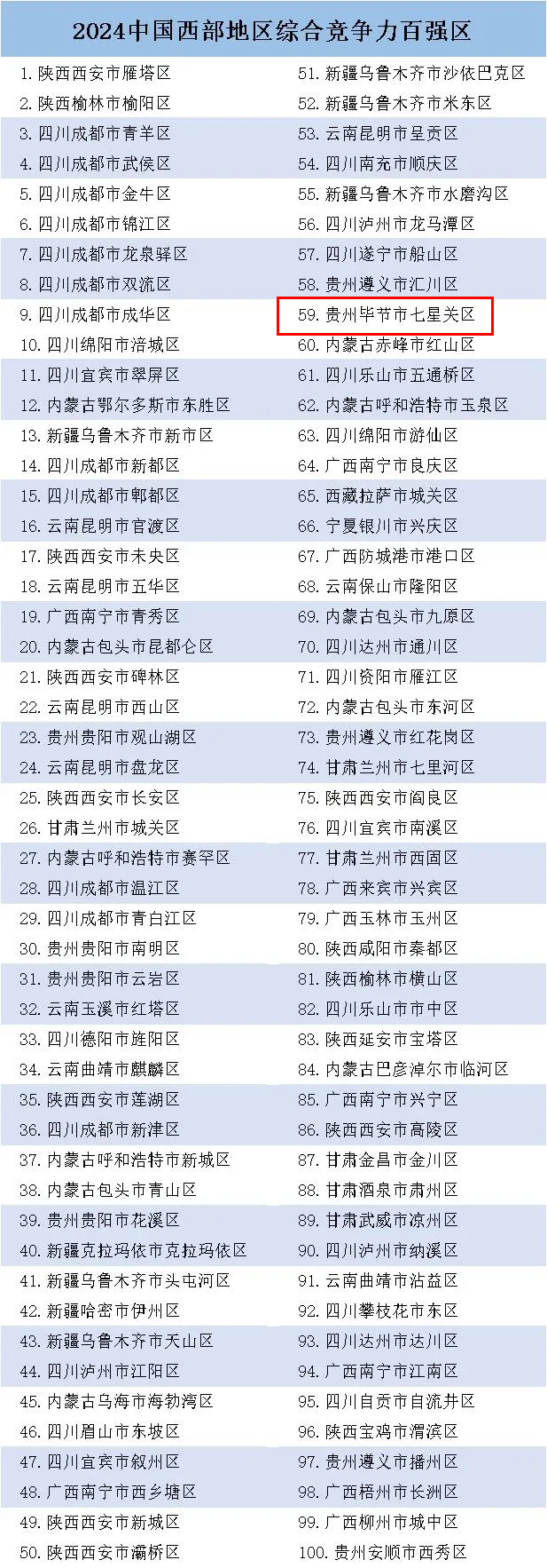竞争力智库北京中新城市规划设计研究院等机构在北京发布《中国县域发展监测报告2024》其中金沙县上榜2024中国西部地区综合竞争力百强县市七星关区上榜2024中国西部地区综合竞争力百强区