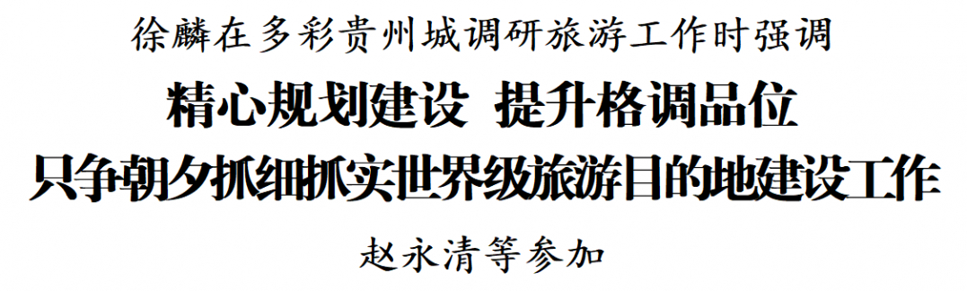 10月8日,省委书记、省人大常委会主任徐麟在多彩贵州城调研旅游工作并主持召开座谈会,强调要深入学习贯彻党的二十届三中全会精神和习近平总书记对贵州旅游业发展的重要指示精神,坚持以文塑旅、以旅彰文,精心规划建设,提升格调品位,打造多彩贵州风景眼和爽爽贵阳会客厅,点面结合推动贵州旅游业高质量发展,只争朝夕抓细抓实世界级旅游目的地建设工作。省政协主席赵永清,省领导卢雍政、胡忠雄、郭锡文、蔡朝林参加。