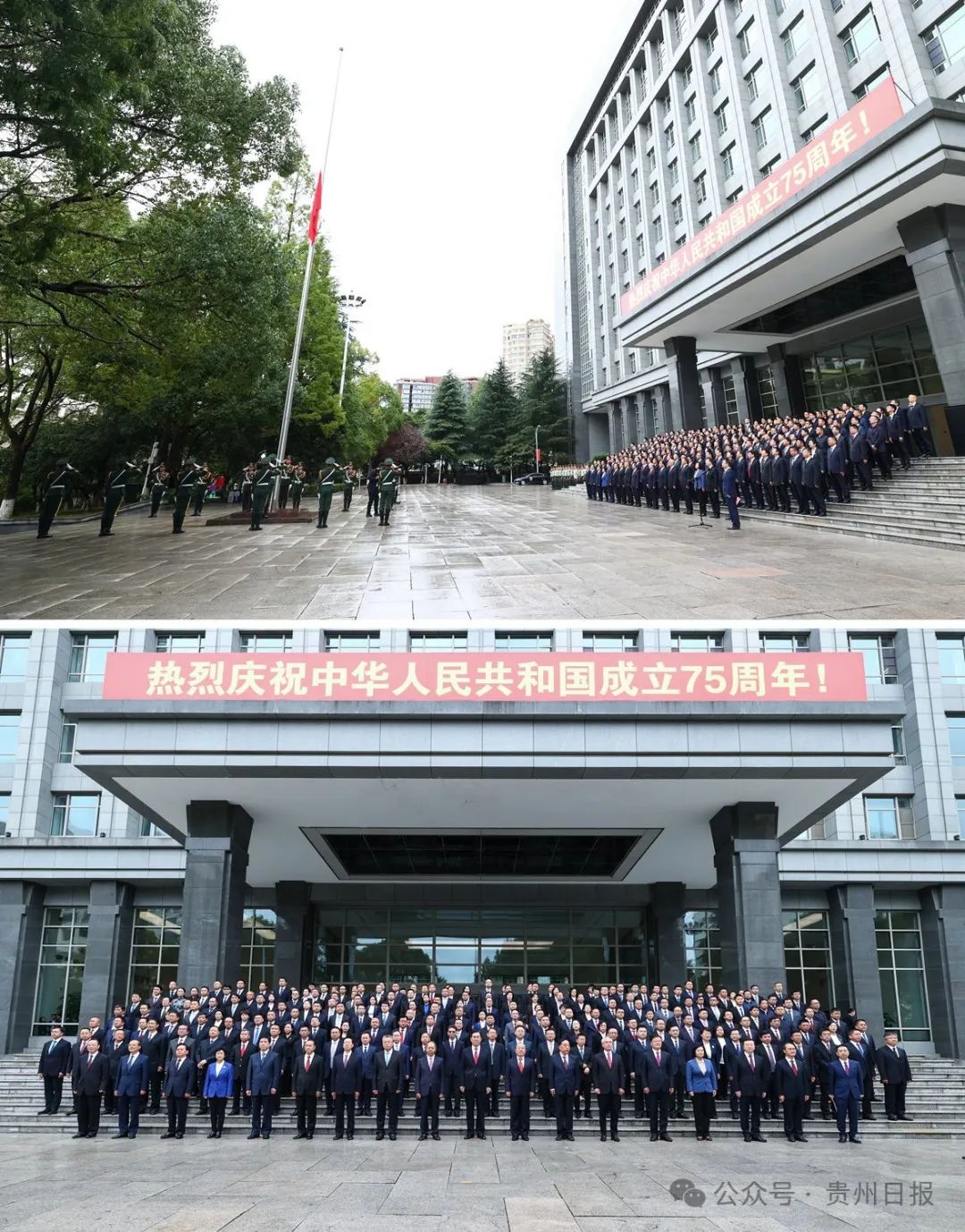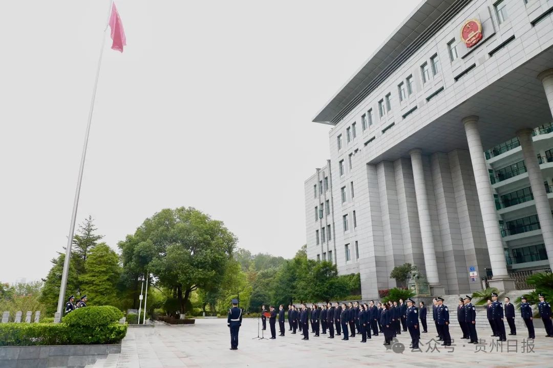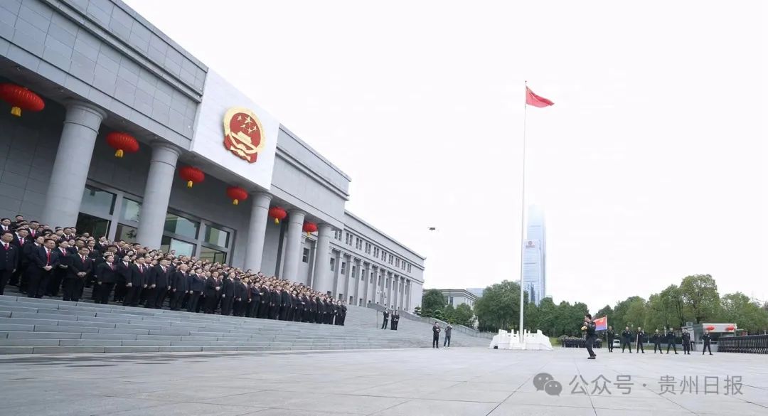 节日里的黔中大地,红旗招展、花团锦簇,洋溢着喜庆热烈的氛围。在各机关驻地,国旗护卫队队员迈着铿锵有力的步伐,护卫着五星红旗来到国旗杆下。伴随着《义勇军进行曲》响起,鲜艳的五星红旗冉冉升起,迎风飘扬。全体人员面向国旗行注目礼,齐声高唱国歌,共同祝愿伟大祖国繁荣昌盛,由衷表达热爱中国共产党、热爱社会主义、热爱祖国、热爱人民的深厚情怀。