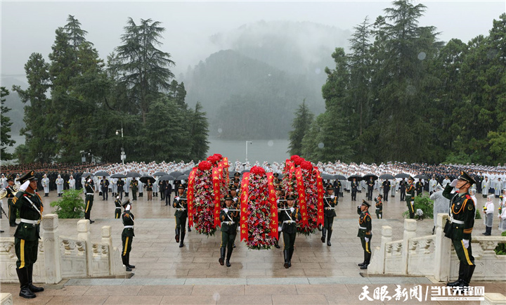 上午10时许,敬献花篮仪式正式开始。12名卫兵迈着铿锵有力的步伐,从广场两侧正步行进至纪念碑前伫立。全场齐声高唱中华人民共和国国歌。国歌唱毕,全场肃立,向英雄烈士默哀。默哀毕,手持鲜花的少先队员献唱《我们是共产主义接班人》,并致少年先锋队队礼。军乐团奏响深情的《献花曲》,14名礼兵护送着花篮正步走向纪念碑,将花篮摆放在纪念碑基座上。徐麟缓步登上纪念碑基座,在花篮前驻足凝视,仔细整理花篮缎带。随后,省党政军领导和社会各界代表依次缓步绕行,瞻仰纪念碑,表达对英烈的深切缅怀和崇高敬意。