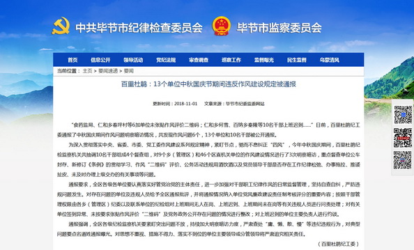 毕节市纪委监委网站:百里杜鹃:13个单位中秋国庆节期间违反作风建设规定被通报