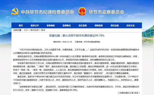 毕节市纪委监委网站:百里杜鹃:群众点赞干部作风满意度达99.78%