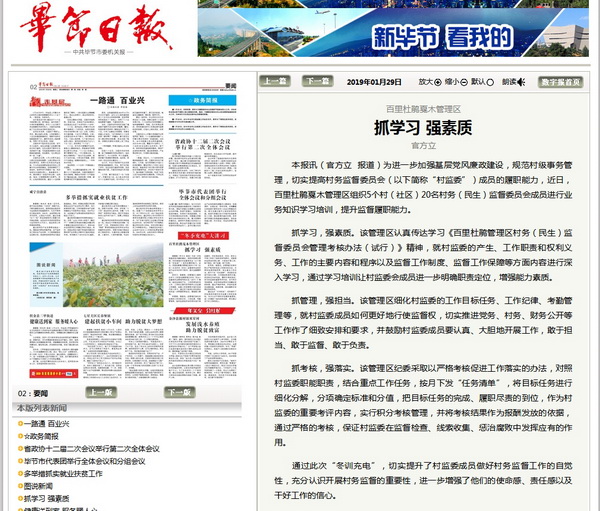 抓学习,强素质。该管理区认真传达学习《百里杜鹃管理区村务(民生)监督委员会管理考核办法(试行)》精神,就村监委的产生、工作职责和权利义务、工作的主要内容和程序以及监督工作制度、监督工作保障等方面内容进行深入学习,通过学习培训让村监委会成员进一步明确职责定位,增强能力素质。
