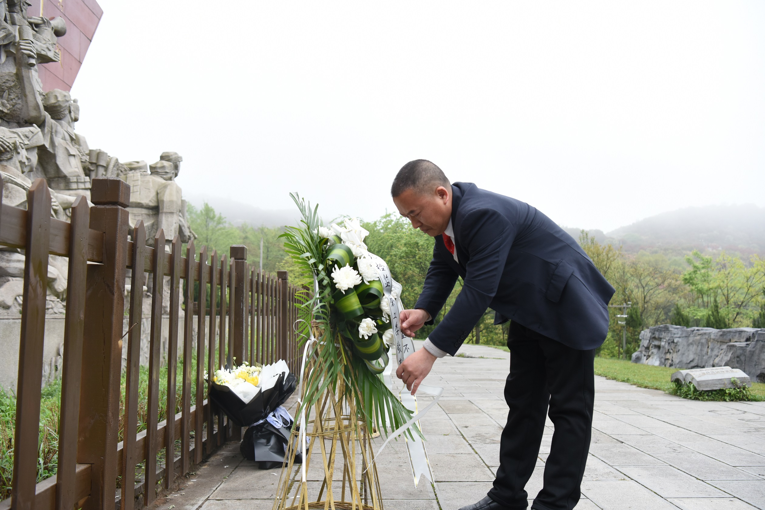 在黄家坝阻击战纪念碑前,全体纪检监察干部庄严肃立,百里杜鹃管理区党工委委员、纪检监察工委书记袁正义代表全体纪检监察干部向革命烈士敬献鲜花,并组织干部向革命烈士默哀。