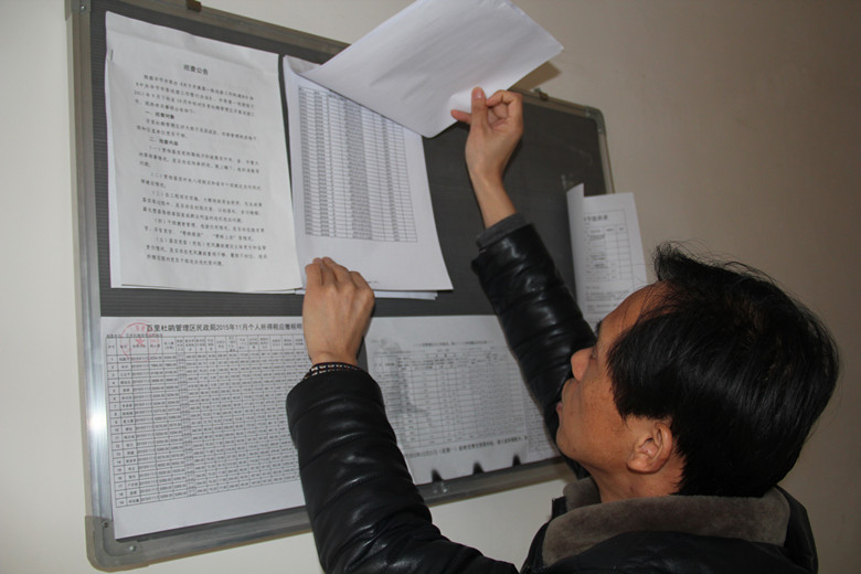 图为督查组查看干部考勤公示情况 (纪工委党风政风监督室尹珺珺)