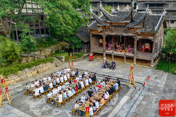 每逢国庆,“板凳宴”成为了贵州省遵义市播州区苗族同胞欢庆佳节的一道靓丽风景线,亲友邻居们齐聚一堂,一边载歌载舞,一边品尝佳肴,一边共叙家常,共祝祖国繁荣昌盛、年年丰收。(贵州省遵义市播州区纪委监委供 周丁浩 摄)