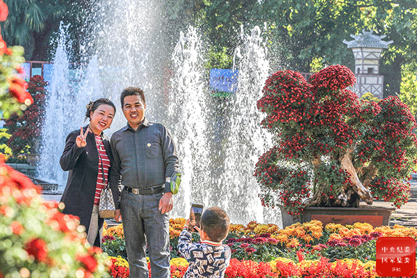 国庆佳节,在灿烂的秋阳里,小小摄影师高举手机拍照,定格爸妈灿烂幸福的笑脸,记录花团锦簇的盛世繁华。(河南省洛阳市涧西区纪委监委供 段万卿 摄)
