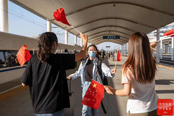 国庆长假,外地求学的学子乘坐高铁回家,和家人团聚,为祖国庆生。(河南省漯河市郾城区纪委监委供 王晓 摄)