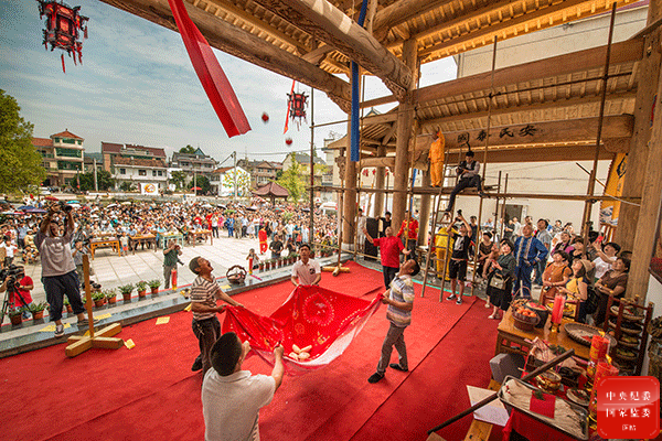 国庆佳节,恰逢浙江省常山县招贤镇高埂村新文化礼堂落成。图为该村举办传统“上梁”民俗活动,全村上下共庆乔迁之喜,同迎祖国华诞。(浙江省常山县纪委监委供 李志强 摄)