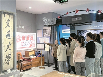 图为4月8日,在交大西迁博物馆内,西迁老教授胡奈赛为青年学子讲述西迁往事。 西安交通大学供图